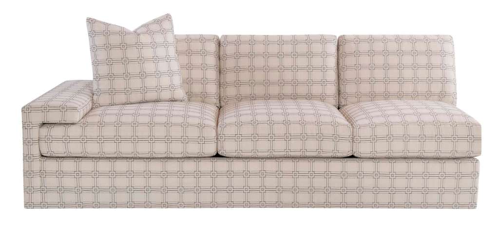 This geometric sofa and sectional series were inspired by European luxury fashion. Susan designed the Denby to be low and deep making the series inviting and comfortable. Signature arms wrap over the seat cushion creating not only a modern attitude, but also an efficient solution for keeping the seat cushion in place. One 20-inch goose feather throw pillow, weltless with hidden zipper standard in fabric. When ordering this item in leather, please note that pillows are not included and must be purchased separately. To match the standard pillows included with the fabric version, order an additional quantity of pillow SKU HC920-96. Spring-Down seat cushion and Blend-Down back cushions standard.