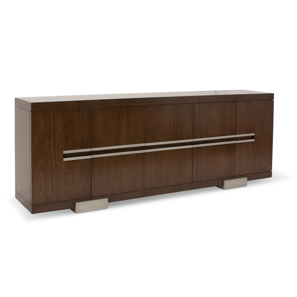 Wood Species: Walnut | Finish: Custom Walnut 6 Center Drawers | 1 Door with Two Adjustable Shelves on Each EndNo Hardware: Warm Silver Pearl Finger Pulls and Feet Width: 96” | Height: 34” | Depth: 18”