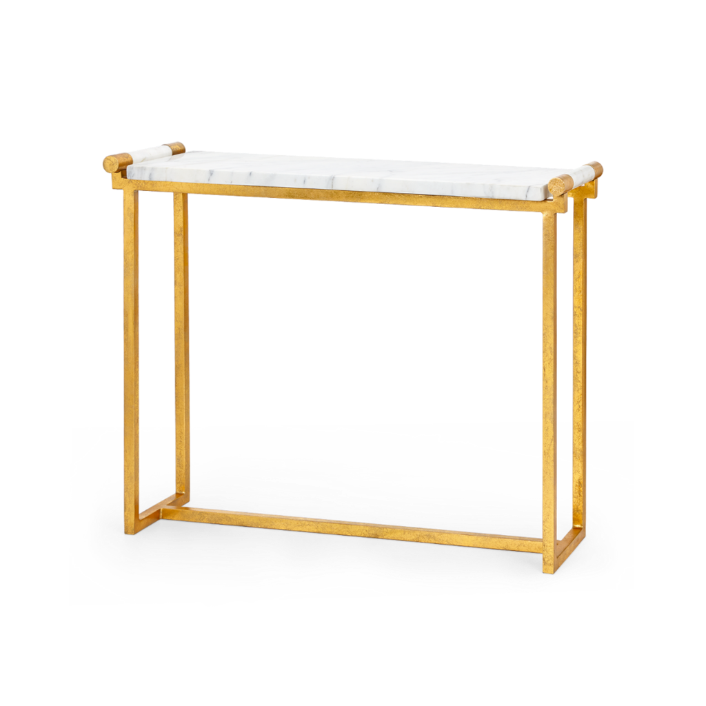 The sleek and polished Diana Console Table makes a glamorous addition in an entryway, corridor, or living room. Its Art Deco-inspired silhouette is brought to life in gold leaf, with a single slab of rich, lightly-honed marble making up its surface. Two handlebar accents bordering the table top bring the materials together, a thoughtful detail that reflects its high-end design. A chic pick for cosmopolitan tastes, the Diana could also lend itself to a lovely bar setup, especially in a home or apartment that's a little tight on space. Just imagine the look of a sparkling crystal decanter displayed on that marble—perfection.