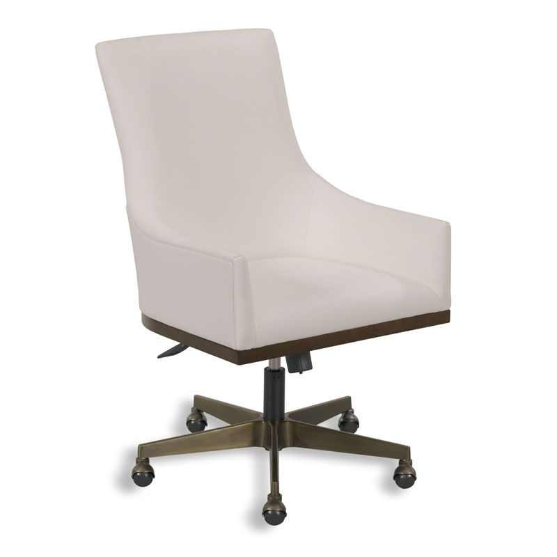 A curved upholstered back forms descending curved arms that flank an upholstered seat elevated on a wood seat frame with five tines and wheels. This chair has adjustable heights, a tilt setting and a 360 degree swivel.