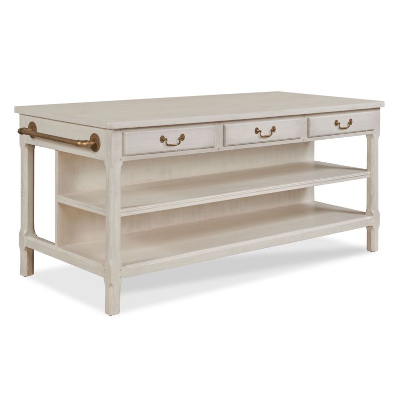 A significant design for kitchens inspired by the Arts and Crafts style movement featuring a weathered finish rough sawn texture. The rectangular planked top rests over sturdy chamfered posts and an apron rail that is fitted with three drawers over two handy shelves.