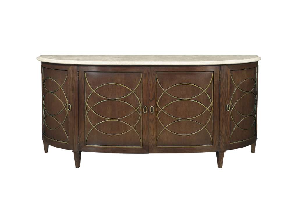 This elongated take on a classic French demilune form features clean, smooth lines and simple tapered legs. Made from ash solids and white oak veneers, the doors are accented with Duchamp Aged Brass oval ring pulls and decorative fret overlays that add an antique touch. Two interior drawers—each with a single Duchamp Aged Brass oval ring pull—are standard, with one drawer fitted with a chocolate-brown colored silver liner. Below the drawers is an adjustable shelf. Behind the left and right doors are two additional adjustable shelves, providing versatile and ample storage for items of different sizes. The Duchamp Credenza is available with a wood top – HC9845-71W or a Faro Limestone top with a satin finish and sealed – HC9845-70S.