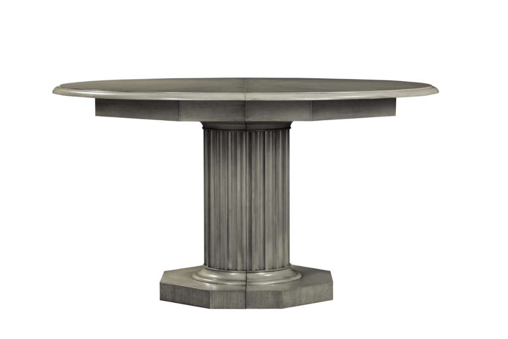 The 54” round Eden Roc Dining Table is exceptional with a radial pattern veneer top resting above a fluted maple center column with a hex-shaped base. Thoughtfully designed for multiple uses - as a center table, games table, breakfast room or dining table - an impressive destination for family gatherings. Top expands from 54-inches to 102-inches with two 24-inch leaves installed. Clearance Below Aprons - 26"
