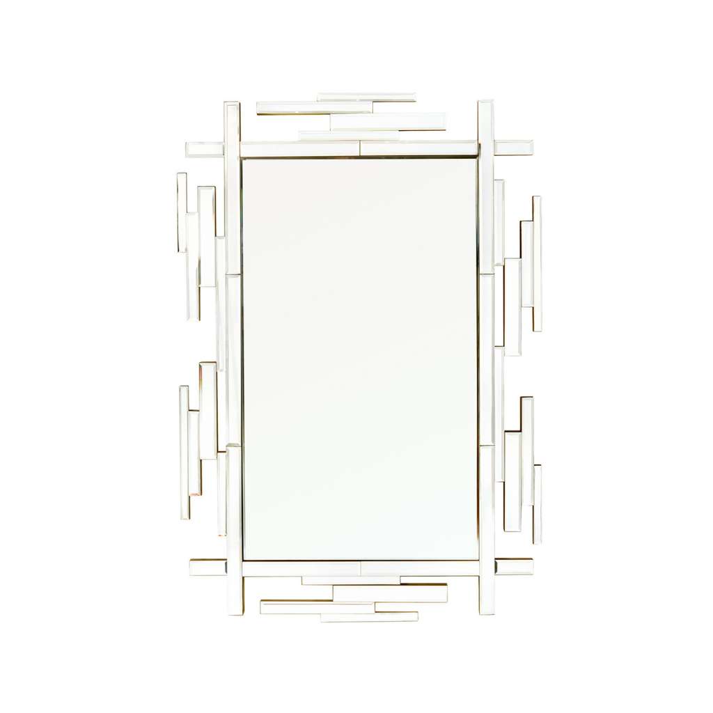 The Edith Mirror marries sophisticated glamour with unexpected design. The large rectangular mirror finds its ornamental upgrade in diamond-like baguette-cut glass panels, also mirrored, which form a deconstructed frame with sleek layers and contrasting dimensions. A thick bronze border adds extra depth and gilded shine. The result is a spectacular statement piece which instantly snags the spotlight, whether placed above a desk, sofa, side table, or mantel. The Edith would also make a beautiful addition as a vanity mirror in a bedroom or bathroom.