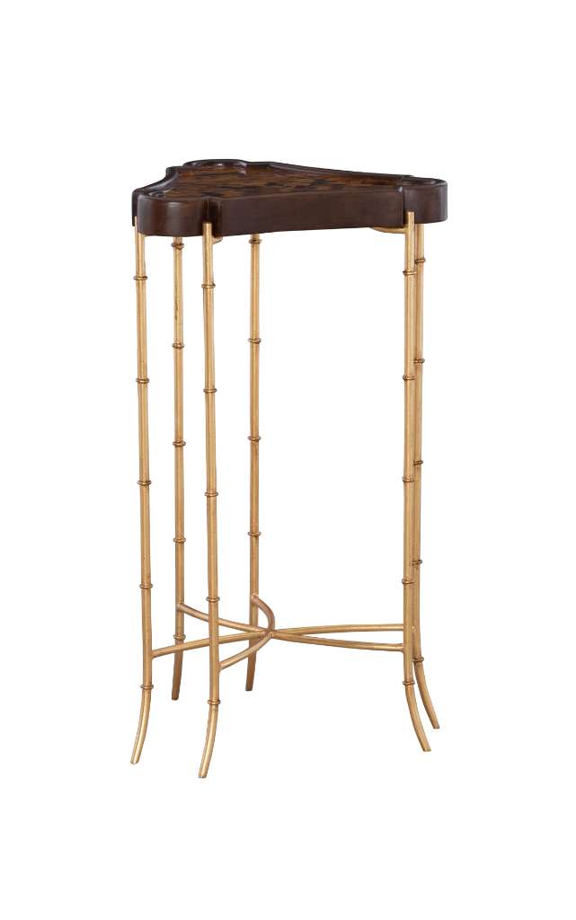 The Edmund Table is inspired by worldly travels, seamlessly blending antique influences with refined craftsmanship. The top is crafted from a brick motif tiger penshell inlay and framed by a solid wood border finished in Hickory Chair’s classic Truffle finish. Delicate bamboo knuckle metalwork, clad in hand-applied gilt gold leaf, forms the elegantly tapered legs, while a flower-esque stretcher adds an artistic, sculptural touch. The Edmund Table embodies a sense of collected sophistication, bringing the charm of global exploration into any space.