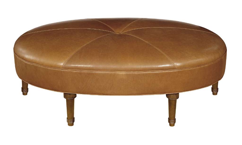 The Egg Ottoman has a beautiful oval shaped top that sits upon six (6) turned feet. With a buttoned top, this ottoman can double as a coffee table or as an area to perch for extra seating. This Egg Ottoman features the mitered and seamed pattern in leather. When ordered in fabric, the top is standard without the mitered and seamed upholstery treatment. Oxford finish shown. Standard in leather with mitered top and saddle stiched top with button.