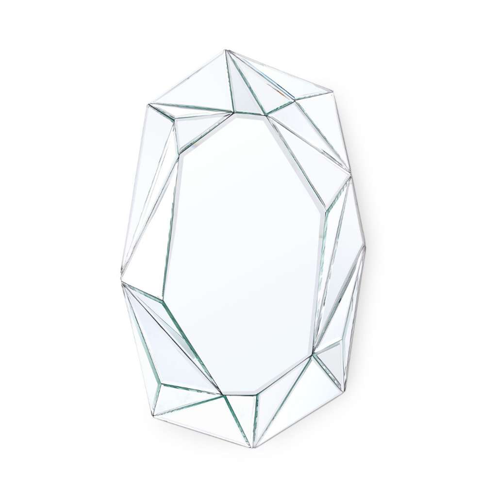 Shining in all its splendor, the Elaine Mirror is a geometric gem—the perfect pick for a room in need of some opulent glitz. An array of mirrored pieces have been cut, hand-beveled, and applied on wood to embody the dazzling facets of a diamond. Irregular angles give the center display a unique, organic shape. Its three-dimensional form, bordered by antique-finished brass ensures that the Elaine always stands out, bursting from a wall like a precious stone on a piece of jewelry. It's hard not to feel glamorous when gazing at your reflection in the Elaine.