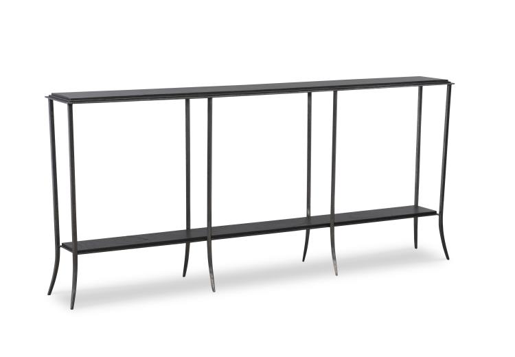 W 72 D 10 H 33 Modern console table with a metal frame and dark scagliola top and shelf In Stock Buy Now