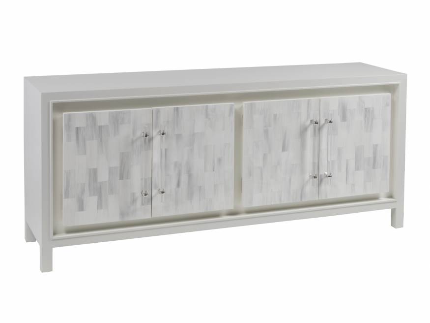 Faux horn motif hand-painted by artists on individual resin tiles in a light gray/white bone coloration with custom acrylic hardware and bright nickel finished clasps located on the four doors which hide four adjustable shelves and a ventilated back. Faux horn tiles will vary in appearance and coloration from piece to piece.