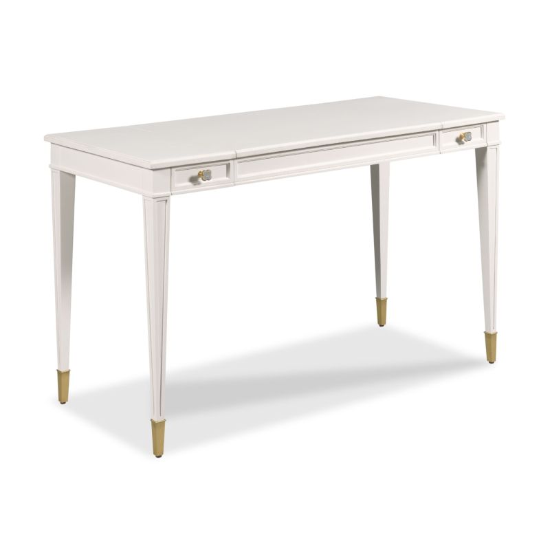 Traditional clean lines define this delightful makeup vanity. This vanity features two drawers that flank an interior compartment fitted with multiple areas for a variety of storage solutions. The top compartment lifts to showcase the interior compartments and a mirror for makeup application. The table is elevated on tapering legs that are fitted with brass sabots.