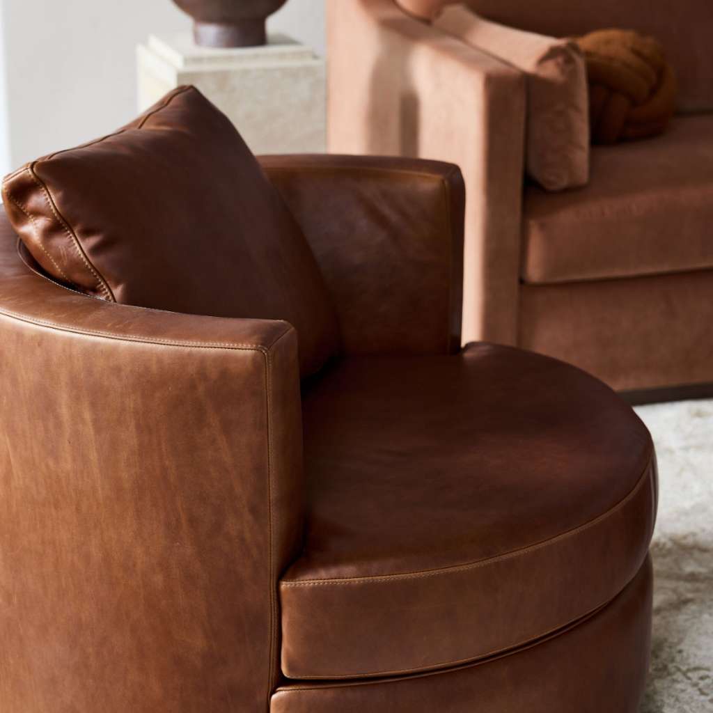 The Emma swivel chair is curvy and comfy, featuring a half-circle back and loose back cushion.