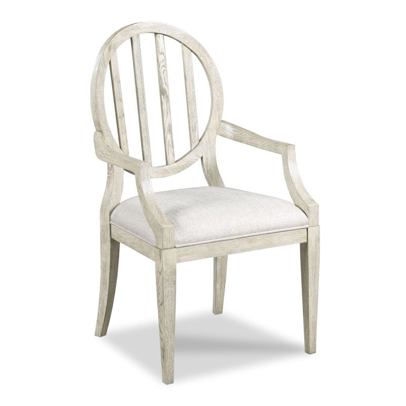 A graceful oval back is accented with a colonnade of shaped slats above an upholstered seat raised by gradual tapering legs.