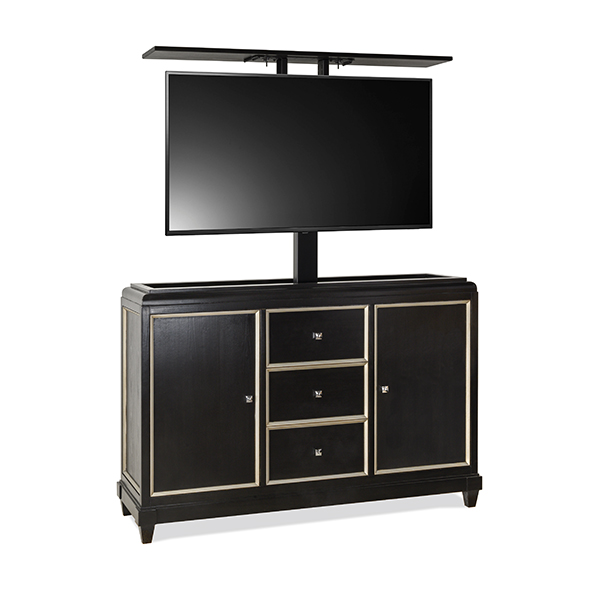 Body Finish: Sheer EbonyTrim & Accents: Metallic StarlightHardware: Modena Knob in ChromeTV Opening: 53"Lift Roates 360 Degress Manually Width: 60” | Height: 40” | Depth: 20”