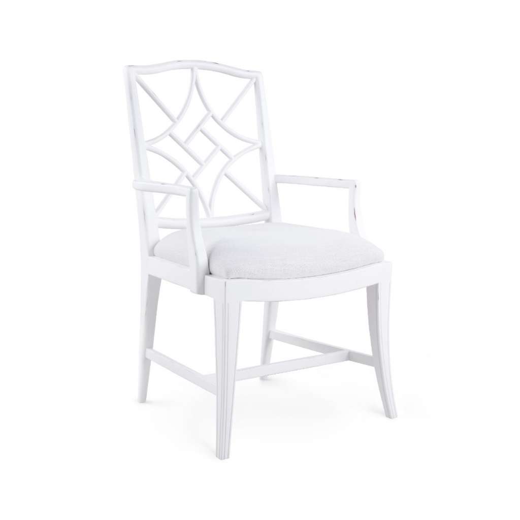 The Evelyn Collection brings Eastern-inspired elegance to life. Our simplified interpretation of Thomas Chippendale’s famous chinoiserie design gives our chairs a more relaxed, contemporary feel with a dash of country charm. Created from mahogany with an antiqued lacquered white finish, the frame of the Evelyn Armchair boasts an intricate fretwork back nodding to its Asian inspiration, with a softly rounded top. Gently curved details appear throughout, from the slight dip in the seat and armrests to the fluted, tapering legs. A linen drop-in cushion completes the piece, making it a comfortable yet stylish pick for a kitchen or dining room set.