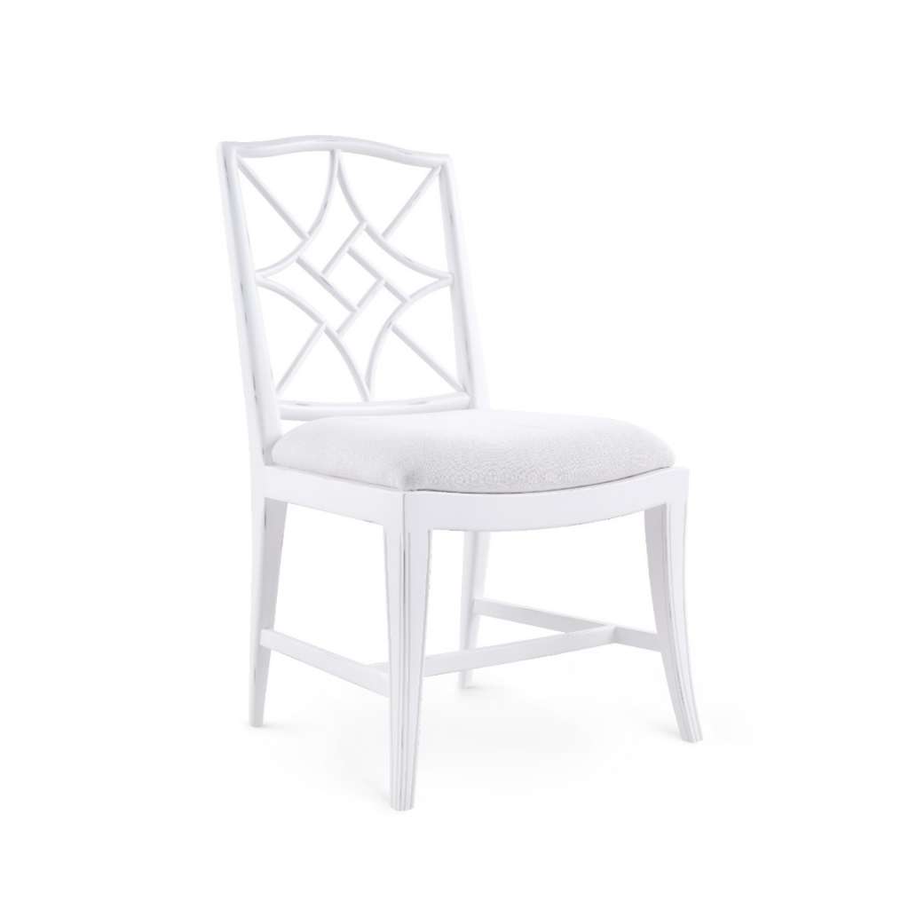 The Evelyn Collection brings Eastern-inspired elegance to life. Our simplified interpretation of Thomas Chippendale’s famous chinoiserie design gives our chairs a more relaxed, contemporary feel with a dash of country charm. Created from mahogany with an antiqued lacquered white finish, the frame of the Evelyn Side Chair boasts an intricate fretwork back nodding to its Asian inspiration, with a softly rounded top. Gently curved details appear throughout, from the slight dip in the seat to the fluted, tapering legs. A linen drop-in cushion completes the piece, making it a comfortable yet stylish pick for a kitchen or dining room set.