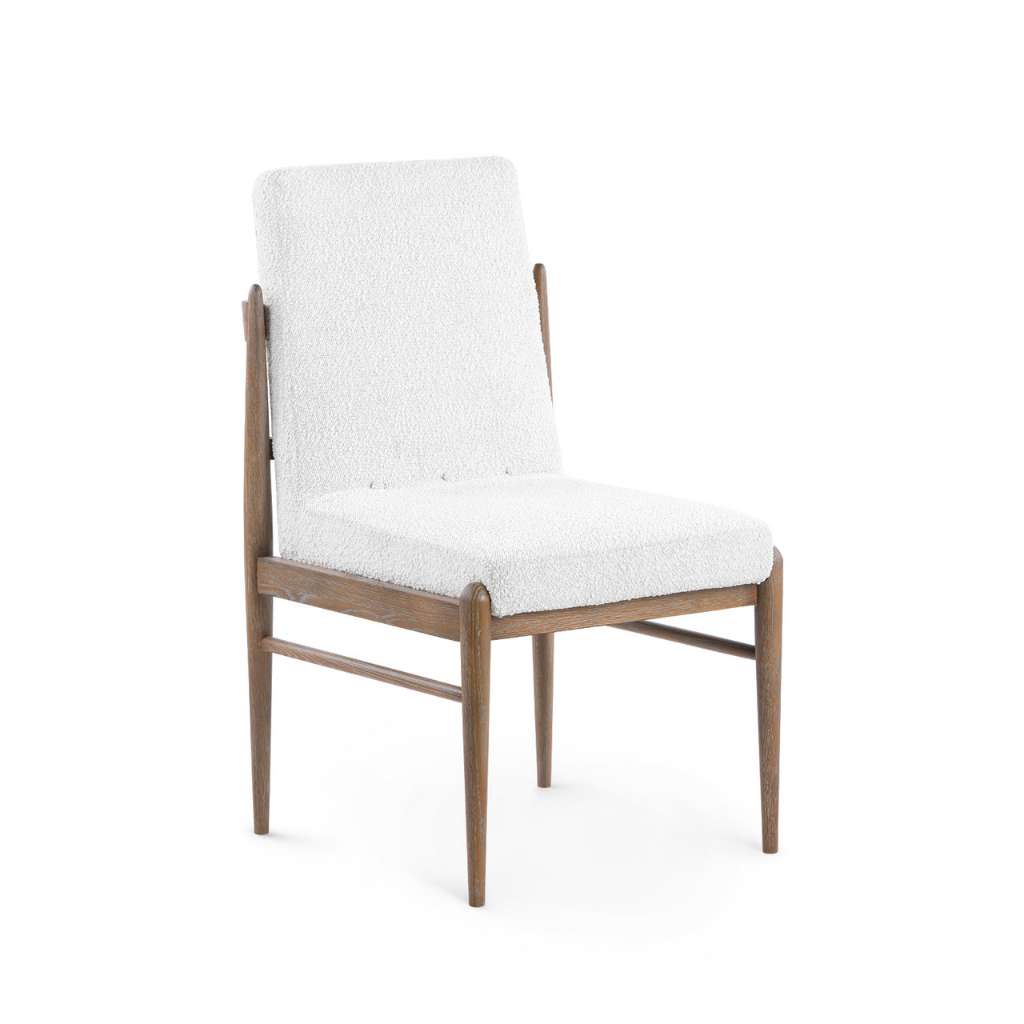 The Everett Side Chair is a luxurious yet versatile piece, crafted from Clear Lacquered Cerused Oak and upholstered in plush bouclé. With larger dimensions than our Oliver chair, it embodies Danish Modern influences through its minimalist design and beautifully showcased wood grain. Softly rounded, tapered legs and a curved top rail provide ergonomic comfort while enhancing its elegant form. Perfect for dining or breakfast rooms, or as a sophisticated desk chair, the Everett Side Chair seamlessly adds style to space.