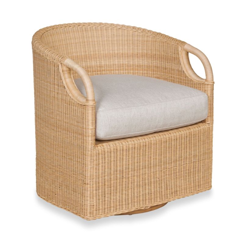 A wonderful lounge chair with a barrel back design crafted from natural rattan that is fitted with a loose cushioned back over an ample upholstered seat cushion over a swivel base.