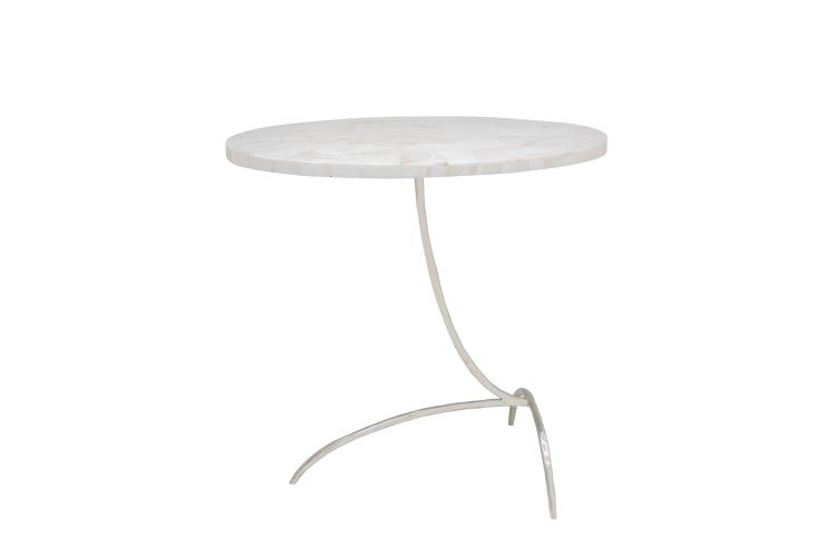 W 22 D 12 H 22 Oval White Polished Clam Stone Accent Table with Silver Gilt Iron Base In Stock Buy Now