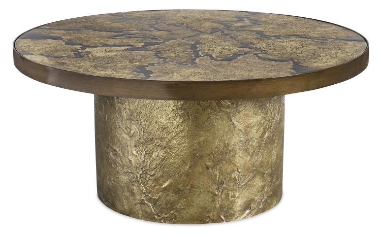 W 40 D 40 H 18 Antiqued finish brass flow cocktail table with textured metal base. Out of Stock