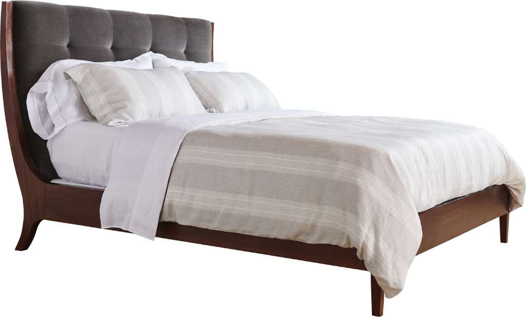 With the popularity of platform beds and Hickory Chair’s prowess of upholstery, the new Frances Bed achieves drama and grace. The tall hand-tailored blind biscuit-tufting is standard on the gracefully sleigh-shaped headboard. The upholstery is framed by beautiful American Walnut. Designed for use with a low profile box spring. The footboard and side rails are the same height. Optional Dark Walnut finish shown. Designed for use with low profile box spring.