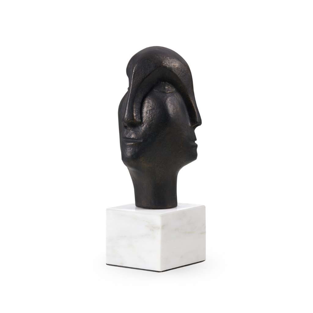 A striking play on perspective gives our Gemma Statue surrealist appeal, enticing its viewer to examine it from every angle. Cubist sensibilities are found in the bold features of its two-sided countenance, cleverly blending modern art with an air of antiquated mystery. Its hand-molded form is rendered in bronze finished iron which stands in visual contrast to the white marble block base. Cool and cultured, the Gemma can add a dash of creativity to even the most classic decor.