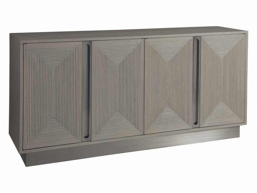 Contemporary design crafted from white oak solids and quartered oak veneers in our cerused white grey finish. Four doors feature panels in a concentric recessed pattern of small half-round moldings, two drawers, two adjustable shelves, ventilated back, inset hardware and plinth base in brushed stainless steel.