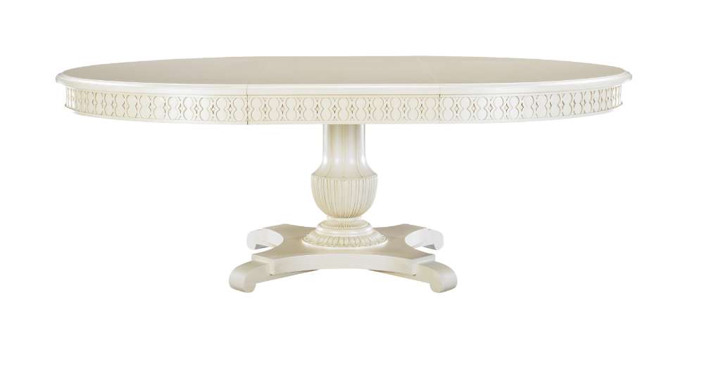 The Gustav Pedestal Dining Table is made from fine mahogany solids and veneers. The HC5341-70 Gustav Round Dining Table Top with the Figure-8 Apron extends from a 60-inch round to an 84-inch oval with the single 24-inch leaf. The HC5342-70 Gustav Pedestal Base is hand carved from mahogany. The fluted carved urn terminates with leaf carving. The carved urn sits upon a raised four leg base. Standard in Oxford finish. The Gustav Pedestal Base and Top are part of the Personal Preference Dining Table program.