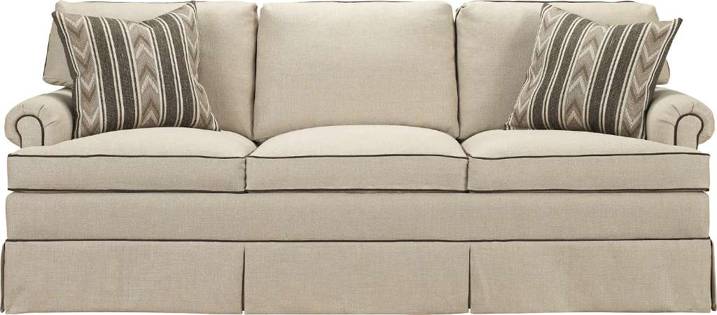 Enjoyably simple - beguilingly comfortable - the Guthery teaches the art of refined relaxation. Moderate panel arms, plump "T" shaped seat cushions and overstuffed loose pillow back ensure comfort. Two 20-inch 100% goose feather throw pillows standard. 3-piece Plush-Down seat cushion and 3-piece Blend-Down back cushion standard. Optional contrasting fabric, welt and skirt trim shown. The Guthery series includes sofas, love seat, chair, glider swivel, swivel and ottoman. It is also available Made To Measure from 28 to 120 inches in length. A companion Guthery Ottoman is available in widths from 18 to 60 inches.
