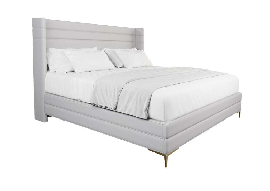 The Hamlin Upholstered Bed features a distinctive vertical wing detail, elegantly capped with two tiers of double welt. This signature double welt detailing is echoed along the center of the side and foot rails, creating a cohesive design. The headboard is framed by full vertical wings, while the side and foot rails rest on tapered metal legs available in three finishes: Antique Bronze, Antique Silver, Antique Brass. Double welt is standard, while mohair, velvet, and leather options are finished with a refined single welt. This bed is designed to float and is available as a Twin, Queen, King, or California King bed.