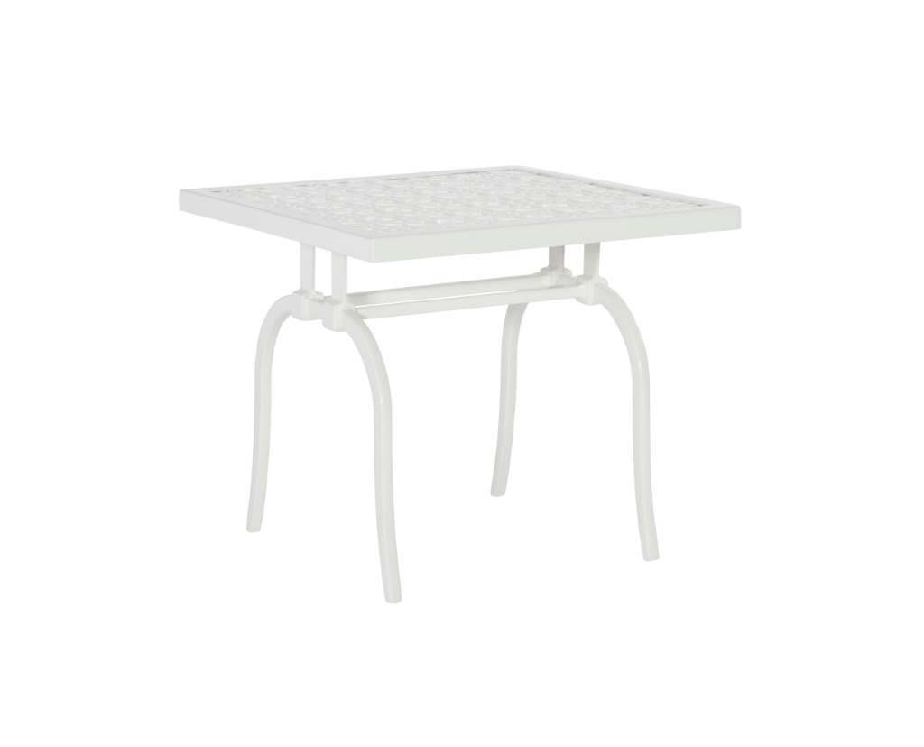 The Haret Outdoor End Table feature the signature fretwork of the series on the top of the table. The tops sit upon a graceful arch joined to the top by two posts. The Haret series is made from cast aluminum and solids. Cloud White finish. Also available in Smoke Grey finish. A companion rectangular Haret Cocktail Table is also available. A custom fitted protective cover is sold separately as HCD8986-PC.