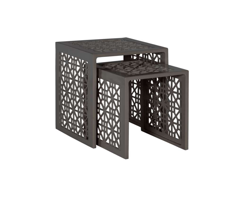 One of the most distinctive items in the Haret outdoor collection are the nesting tables. This nested pair of tables feature the signature fretwork of the series and a Parson’s shape. They are the perfect companion to the Haret Outdoor Chaise Lounge. The Haret series is made from cast aluminum and solids. Shown in Cloud White finish. Also available in Smoke Grey finish. A custom fitted protective cover is sold separately as HCD8985-PC.