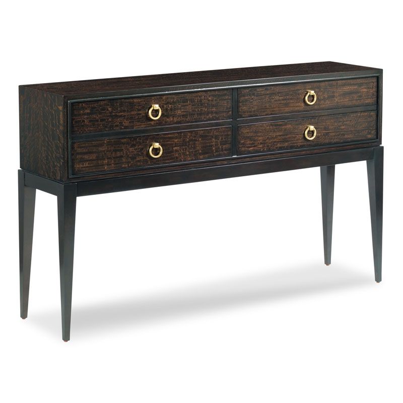 A rectangular top veneered in figured eucalyptus is placed over four individual drawers that are mounted with brushed brass ring pulls.