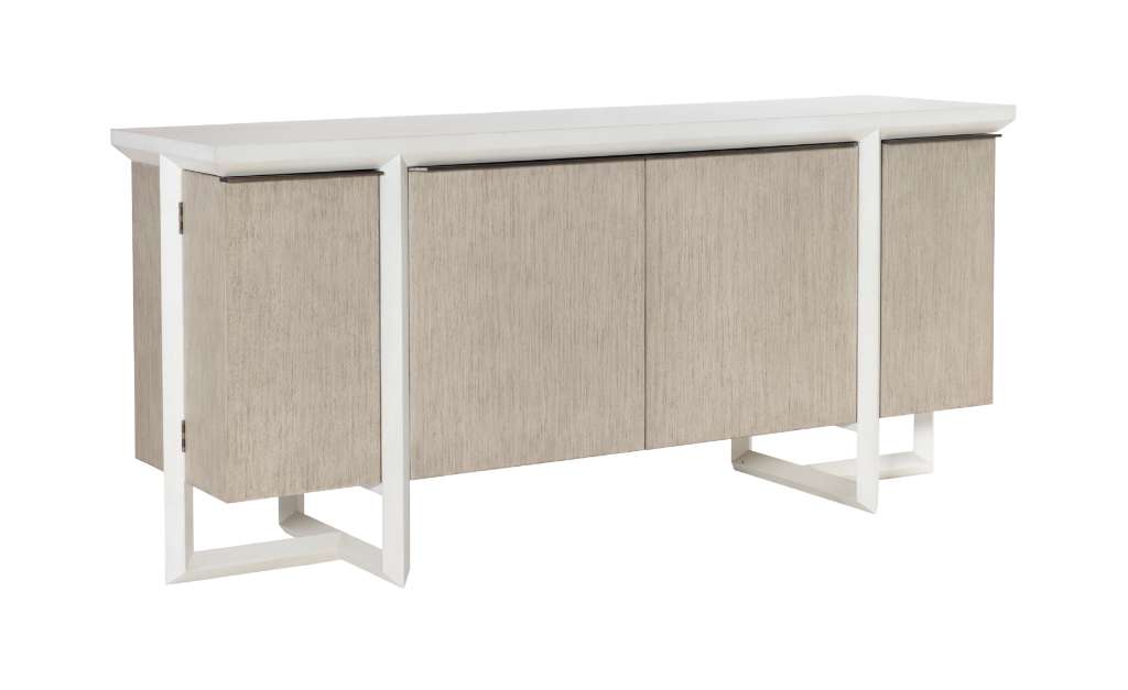 The Hatton Credenza is a perfect complement to the iconic Hatton Dining Table. The Hatton Credenza features unique diamond-shaped legs and precise proportions, it is fitted with robust functional storage. Behind the left and right doors are two adjustable interior shelves with two removable trays accented with Hatton bronze hardware and a black felt interior. Behind the two center doors is a single adjustable shelf with two upper drawers for additional storage. Each drawer is standard with a black felt liner. Interior and exterior hardware is standard in Hatton Bronze. This item is finished on all sides so it can easily float in a room. ONLY available as shown in a 2-toned finish inspired by our Lynx and Chalk paints.