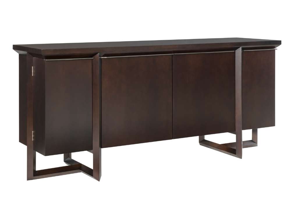 The Hatton Credenza is a perfect complement to the iconic Hatton Dining Table. The Hatton Credenza features unique diamond-shaped legs and precise proportions, it is fitted with robust functional storage. Behind the left and right doors, there are two adjustable interior shelves and a removable tray accented with bronze hardware and a black felt interior. Behind the two center doors is a single adjustable shelf with two upper drawers for additional storage. Each drawer is standard with a black felt liner. Interior and exterior hardware is standard in Hatton Bronze.