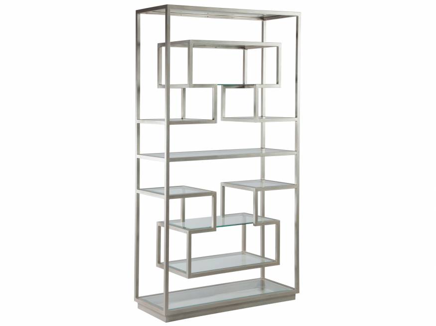 Tubular steel frame with eleven inset glass shelves, all 1-inch beveled and tempered. Shown in the Argento finish, an antiqued silver with gold undertones, but also available in all Artistica Metal Designs finishes.