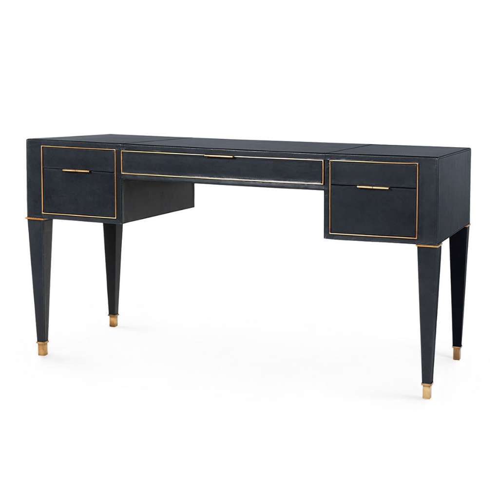 The Hunter Collection showcases Villa & House’s signature use of rich materials and fine craftsmanship. With our Hunter Desk, a neo-classical silhouette is elevated to luxurious new heights in lush black leather. Visible stitching in the leather gives the piece a distinguished and distinctly Americana sophistication, all pulled together by thoughtfully placed custom brass accents. Five sleek drawers—two on each side and one in the center—gently glide open to reveal sumptuous micro-suede interiors, reminiscent of an expensive jewelry box. The Hunter is an ideal pick for a stately study or posh home office rooted in classic luxury.