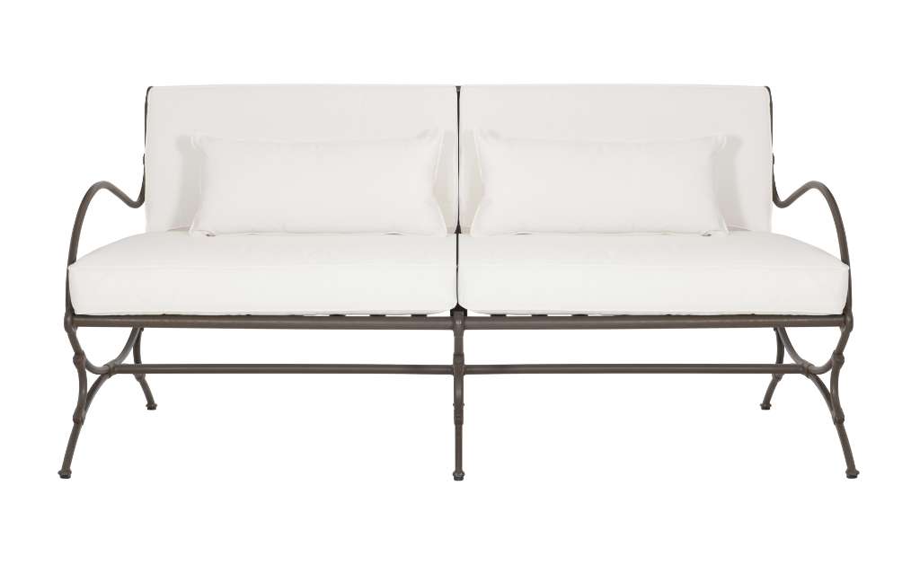 The Ibis Outdoor Collection is named for an Egyptian bird with a distinctive long curved beak that has been idolized from ancient times. The Ibis series is made from cast aluminum and solids and is available in a Verdigris finish. The distinctive metal strap that wraps each joint was inspired by leather wraps that joined vintage rattan outdoor furniture. The Ibis Outdoor Sofa is standard with two DryTech back cushions and two seat cushions. A custom fitted protective cover is sold separately as HCD8901-72-PC.