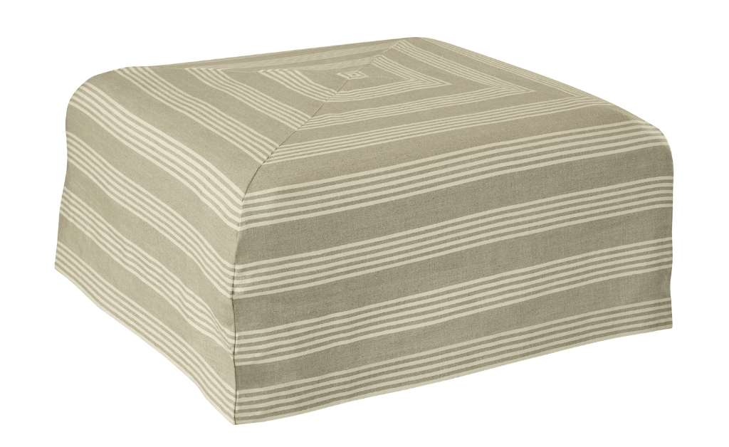 The Inman Slipcover is an option for the Inman Ottoman (HC1510-29). It is a piece that Suzanne has used countless times as a custom-designed piece. The ottoman is square and linear; as such it functions well as a coffee table with a tray on it. The tailored slipcover (HC1510-18) can be personalized by adding an optional decorative mitered detail. Slipcover with special construction box-miter shown.
