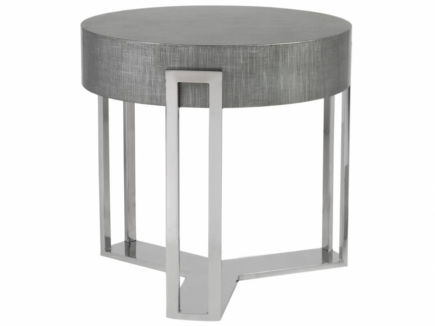 Contemporary design slab top is Beech solids and Maple veneers hand-painted by artists in a gray and silver crosshatch pattern over silver leaf, enhanced by a true lacquer finish. The polished stainless steel sled base has cutouts on the posts.