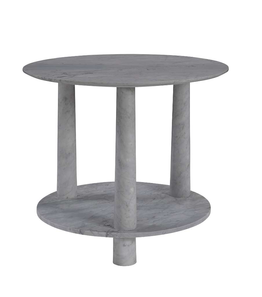 The Ivo Occasional Group is expertly crafted from solid honed Carrara marble. Each piece features a refined chamfered edge along the perimeter and delicate coned legs. While the substantial marble construction ensures a strong presence, the open legs and lower shelves lend a visually light and elegant quality to the design.