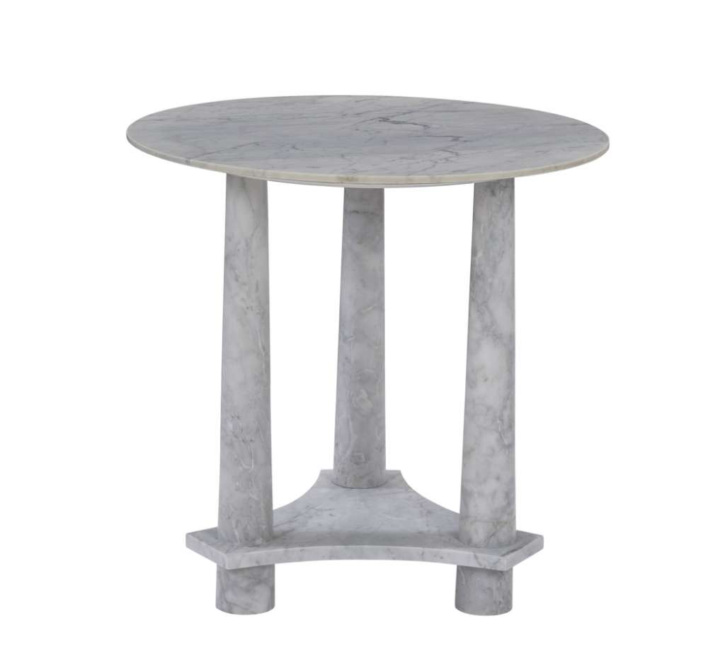 The Ivo Occasional Group is expertly crafted from solid honed Carrara marble. Each piece features a refined chamfered edge along the perimeter and delicate coned legs. While the substantial marble construction ensures a strong presence, the open legs and lower shelves lend a visually light and elegant quality to the design.