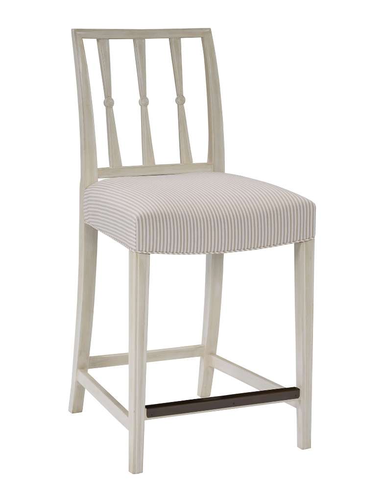 The Jardin Counter Stool, Bar Stool, and Side Chair are perfectly scaled and attentively detailed. Each piece features decorative beadwork on the legs and back, gracefully shaped uprights, and intricate compound angles. Inspired by an antique from Suzanne Kasler's personal collection, this series embodies timeless charm. The Jardin Counter and Bar Stools come standard with a distinguished Antique Brass stretcher guard.
