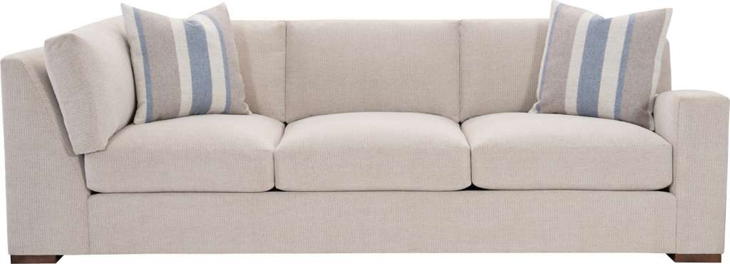 The most luxurious seating group of the Everett by Skip RumleyTM collection is the Kevin Sofa and sectional group. The modern aesthetic is accentuated by the generous track arms that gently rise from the back up to the knuckles. A distinctive tailoring detail is the trim upholstered legs sit upon sleek feet that are available in your choice of finish. Loose Blend-Down backs and Spring-Down seat cushions provide generous comfort. Two 22-inch goose feather throw pillows. When ordering this item in leather, please note that pillows are not included and must be purchased separately. To match the standard pillows included with the fabric version, order an additional quantity of pillow SKU HC922-96. Shown in Truffle finish.