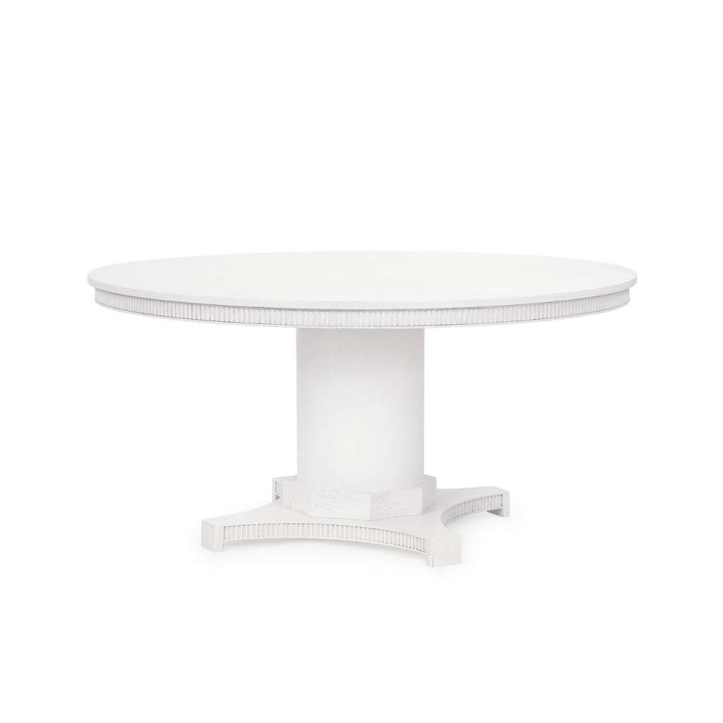 The Kinsley Dining Table is a masterful blend of bold proportions and timeless elegance. Crafted from oak, its round silhouette features grooved details on the apron and base. The subtly neo-classical shape strikes the perfect balance between traditional craftsmanship and modern versatility. The curved octagonal detailing around the base of the central column is a standout feature, adding a touch of architectural refinement. Finished to highlight the natural oak grain with a lustrous white sheen, this table exudes sophistication. It is equally at home in traditional, contemporary, or transitional interiors, making the Kinsey Dining Table a versatile centerpiece that enhances any dining space.