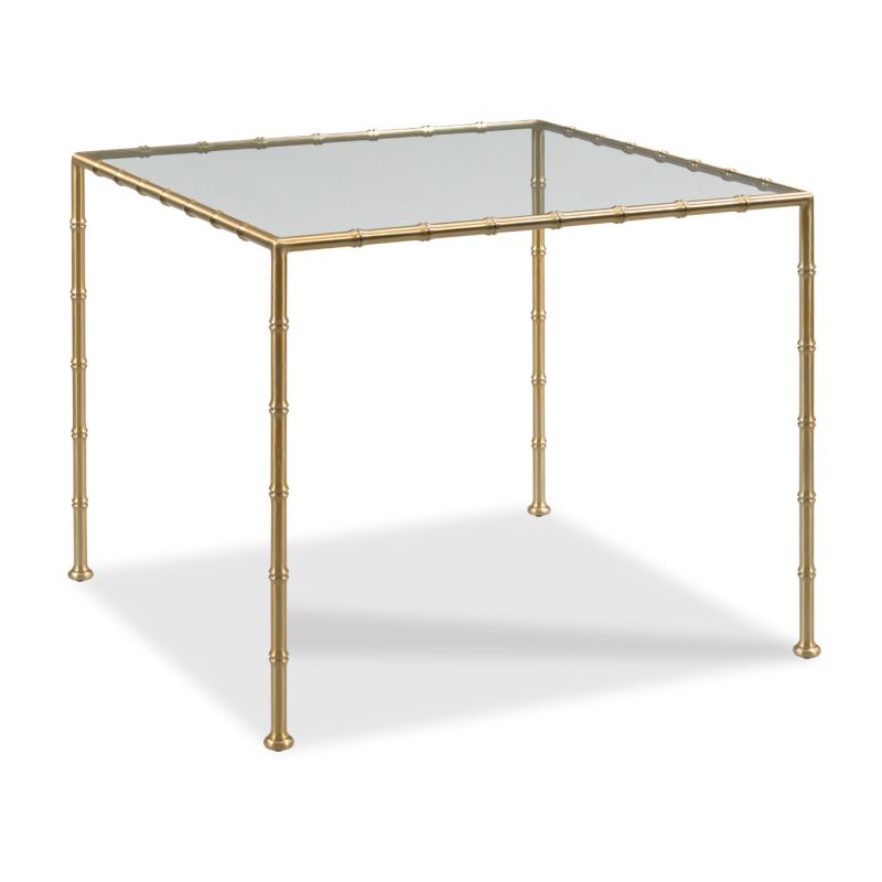 This lovely game table is designed in the spirit of 19th Century English Regency originals. The square top is fitted with a 3/8" tempered glass top elevated on faux bamboo turned brass legs.