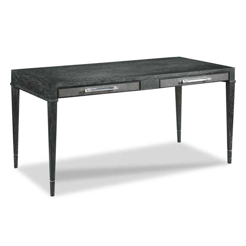 A rectangular top resting over a pair of handy drawers that are overlaid with top grain gray leather and mounted with lucite handles. The desk is elevated on tapering KD legs.