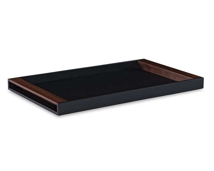 W 21 D 13 H 1.5 Large ebony leather and oiled walnut tray. Angled handles make for a comfortable lift. In Stock