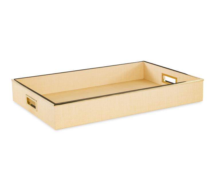 W 28.1 D 18.7 H 3.9 Large raffia tray with polished brass details. In Stock