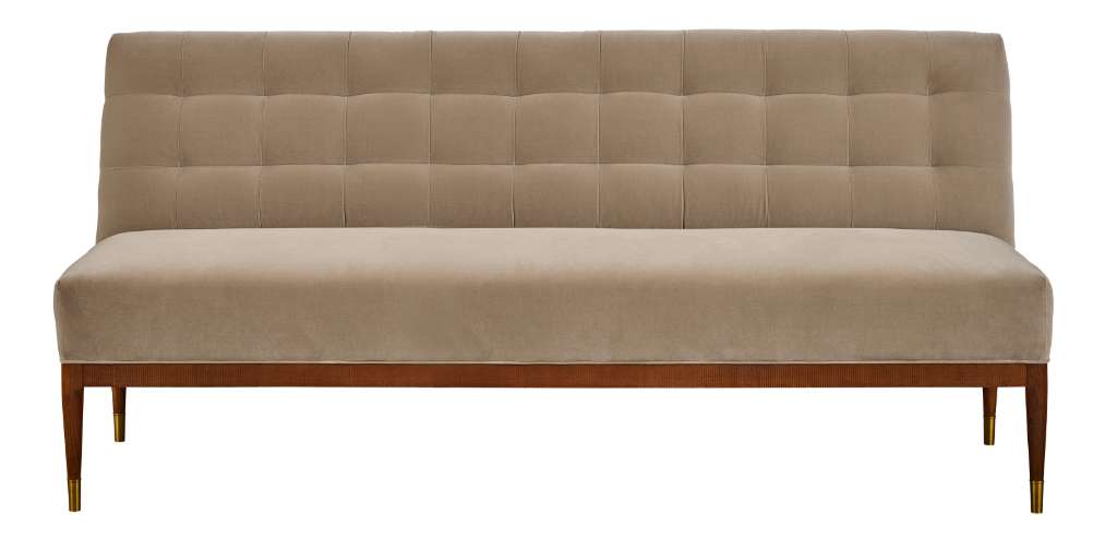 Inspired by the French Moderne chairs of the 1930s, the Laurent series has an elegantly contoured back, a reeded apron, and finely tapered legs terminating in French Brass ferrules. Blind Biscuit Tufted with brass ferrules standard on the banquettes.