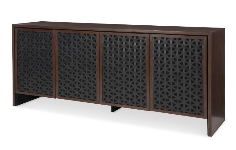 W 78 D 20 H 34 Walnut credenza with hand-woven precision cut leather front. Four touch-latch doors open to reveal black felt lined interior and adjustable walnut shelves. In Stock